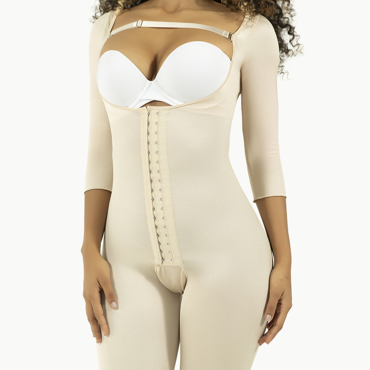 La estabilidad es total gracias al diseño de manga larga y sujeción al pecho. Su manejo es intuitivo y seguro: los 2 Broches Delanteros de alta resistencia facilitan la colocación, mientras que la práctica Tanga Perineal te permite mantener la higiene sin interrumpir tu compresión. Finalmente, luce los resultados de tu cirugía de inmediato: su diseño logra un Levantamiento Natural de Glúteos, moldeando tu contorno con suavidad y confianza